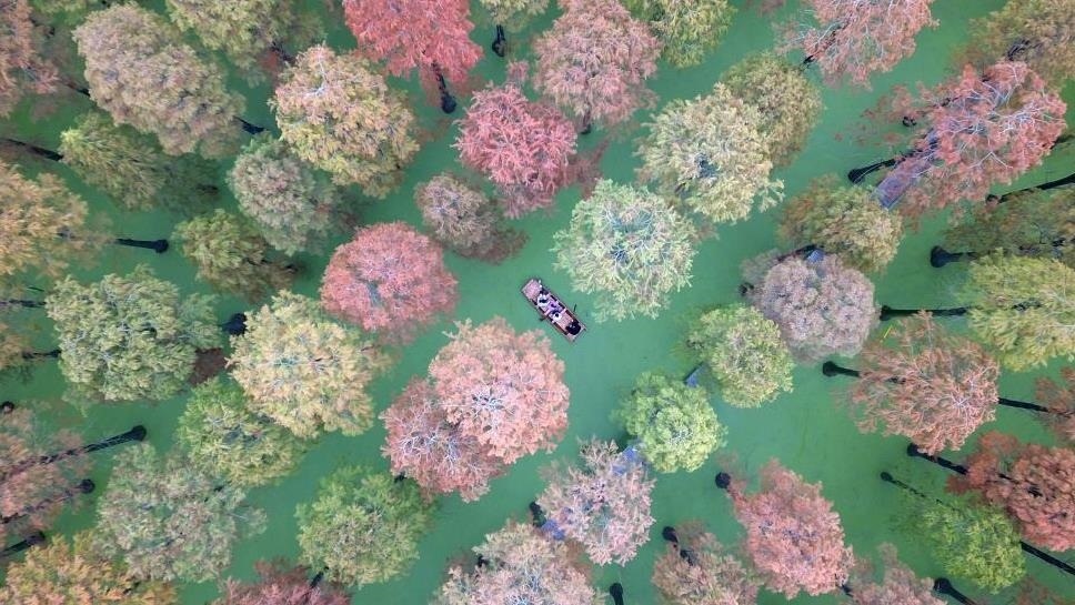 江蘇揚(yáng)州,游客在淥洋湖濕地公園的“水上森林”游玩。初冬時節(jié)的“水上森林”層林盡染,色彩斑斕,美景如畫。