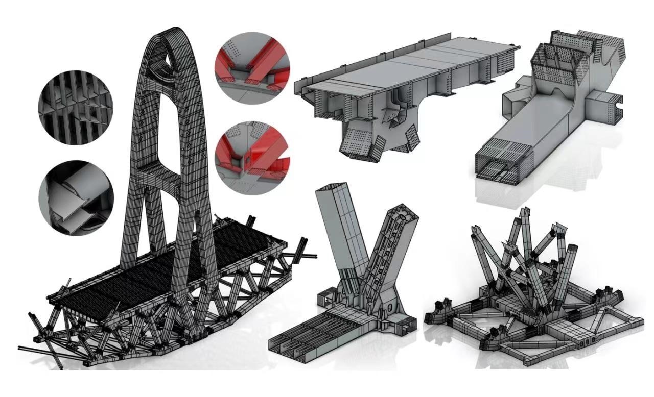 “本橋曲線鋼桁梁構(gòu)造異常復(fù)雜,鋼塔外形為半橢圓變截面,桁架近萬(wàn)根桿件空間定位要求嚴(yán)絲合縫。為了準(zhǔn)確表達(dá)每個(gè)細(xì)節(jié),我們采用了BIM正向設(shè)計(jì)思路,探索出設(shè)計(jì)—建?!蓤D一體化的設(shè)計(jì)流程,開(kāi)發(fā)出自動(dòng)化建模功能和智能化出圖系統(tǒng),為施工企業(yè)和鋼梁制造廠提供高精度的模型和批量圖紙,精準(zhǔn)表達(dá)復(fù)雜的結(jié)構(gòu)信息和設(shè)計(jì)意圖,打通了設(shè)計(jì)—制造—施工全過(guò)程信息傳遞路徑,有效節(jié)約了工期與造價(jià)?!敝需F設(shè)計(jì)集團(tuán)大橋項(xiàng)目主管總工彭嵐平向我們講述了大橋采用的最新智能化設(shè)計(jì)手段。