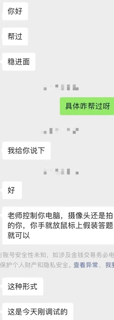 “老師(遠程)控制你的電腦,你手放在鼠標上假裝答題就可以。”