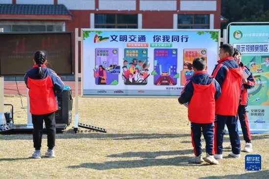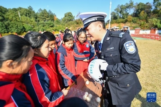 12月1日,在長(zhǎng)沙市望城區(qū)新河學(xué)校,學(xué)生觀看交警手勢(shì)演示。
