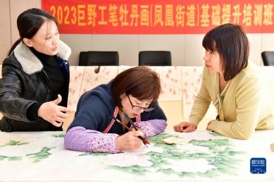 12月2日,在巨野縣鳳凰街道鳳麟社區(qū),來自巨野書畫院的畫師魏蘭蘭(左一)在工筆牡丹畫基礎提升培訓班上指導學員作畫。