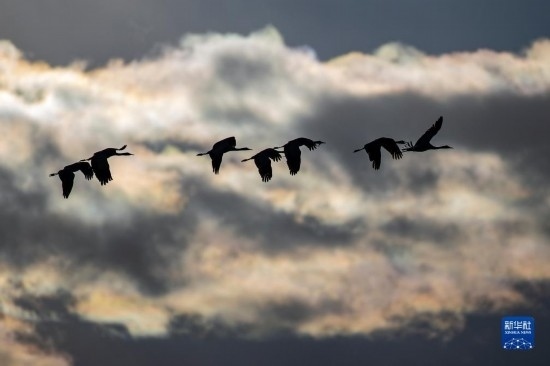 這是12月5日清晨在拉薩市林周縣虎頭山水庫拍攝的越冬黑頸鶴。