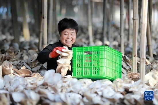 12月6日,在邯鄲市肥鄉(xiāng)區(qū)毛演堡鎮(zhèn)路堡村,菇農(nóng)在采摘菌菇。