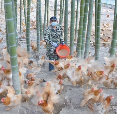 安吉縣利用良好生態(tài)優(yōu)勢(shì)發(fā)展林下養(yǎng)殖。圖為農(nóng)戶正給竹林雞喂食。夏鵬飛攝