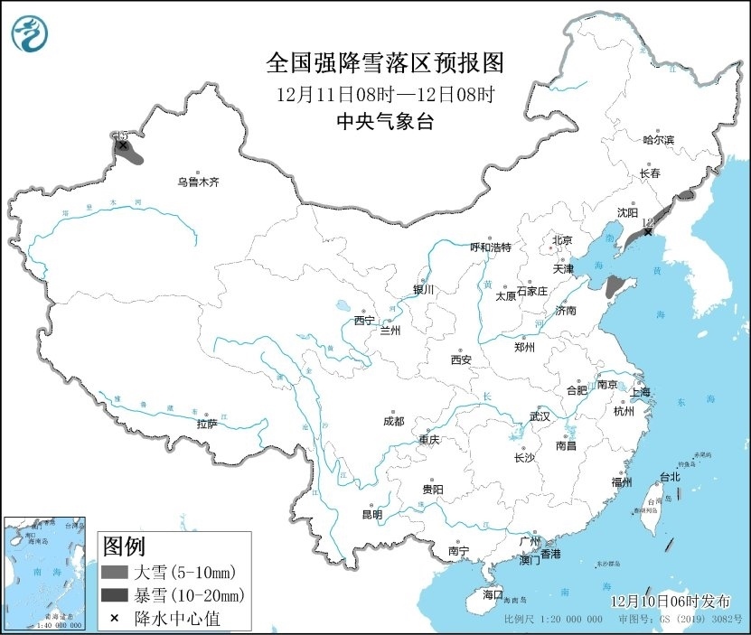 預(yù)計(jì)12月11日08時(shí)至12月12日08時(shí),山東半島北部、遼寧東部、吉林東部及新疆伊犁河谷等地部分地區(qū)有大雪,其中,遼寧東部、新疆伊犁河谷等地局地有暴雪(10~15毫米)。上述部分地區(qū)新增積雪深度4~8厘米,局地可達(dá)10厘米以上。