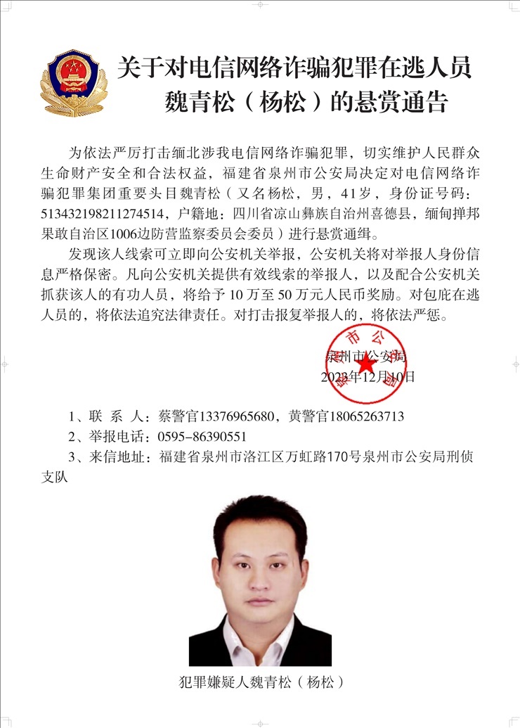 人民網(wǎng)北京12月10日電 (高清揚、梁秋坪)據(jù)公安部消息,針對當(dāng)前緬北涉我電信網(wǎng)絡(luò)詐騙犯罪嚴(yán)峻形勢,我公安機關(guān)先后對多名電信網(wǎng)絡(luò)詐騙犯罪集團重要頭目進(jìn)行公開通緝,形成強大震懾。近日,在掌握相關(guān)犯罪事實和證據(jù)的基礎(chǔ)上,遼寧、福建、重慶等地公安機關(guān)決定對白所成、魏懷仁、劉正祥等10名緬北果敢自治區(qū)電信網(wǎng)絡(luò)詐騙犯罪集團重要頭目進(jìn)行公開懸賞通緝,堅決打掉犯罪分子囂張氣焰。