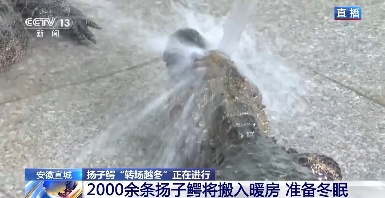 由于今年的溫度比較高,與往年相比,轉(zhuǎn)場越冬推遲了十天左右。轉(zhuǎn)場是按照從小到大的順序。今天是第一天,率先搬家的主要是7歲以下的幼鱷,它們對環(huán)境的適應(yīng)能力更弱一些,需要盡快搬進室內(nèi)。在搬進暖房之前,揚子鱷需要先進行沖洗、消毒?!鞍布摇焙螅蕉康臏囟葧3衷?0℃左右,并且有工作人員定期打掃、保濕,確保揚子鱷安全過冬。