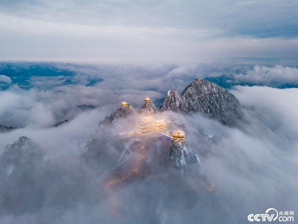 河南洛陽,雪后老君山云霧繚繞。