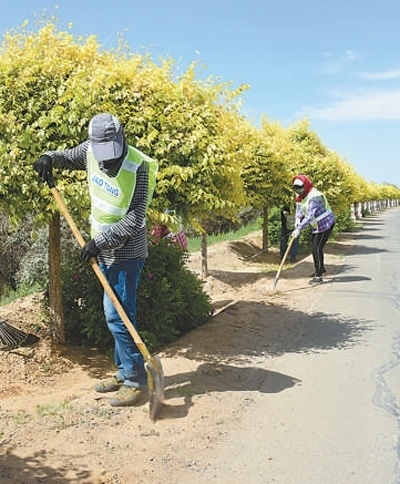 磴口縣防沙治沙局森林管護大隊工作人員在為堤防公路兩側的林帶除草。張 棖 邢 皓攝影報道