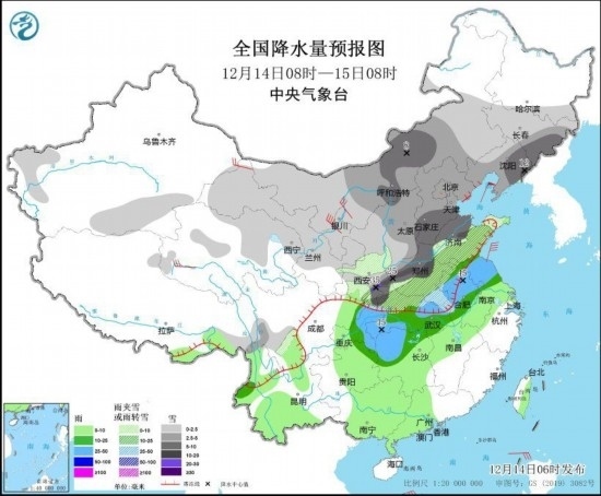 12月14日08時至15日08時,西北地區(qū)中東部、內(nèi)蒙古中西部和東南部、吉林、遼寧、華北、黃淮大部、江淮西部、湖北北部等地部分地區(qū)有小到中雪或雨夾雪,其中,內(nèi)蒙古中部、吉林東南部、遼寧東部、陜西東南部、湖北西北部、河南大部、安徽北部、山東中西部、河北南部等地部分地區(qū)有大到暴雪,陜西秦嶺東部、湖北西北部、河南西部山區(qū)等地局地有大暴雪或特大暴雪(30~35毫米)。江淮東部、江漢大部、江南北部和西部、重慶等地部分地區(qū)有中到大雨。內(nèi)蒙古西部、甘肅河西等地部分地區(qū)有4~6級風(fēng)。