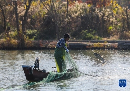 12月14日,在諸暨市白塔湖國(guó)營(yíng)漁場(chǎng)的水域內(nèi),漁民們?cè)谑站W(wǎng)捕魚(yú)。