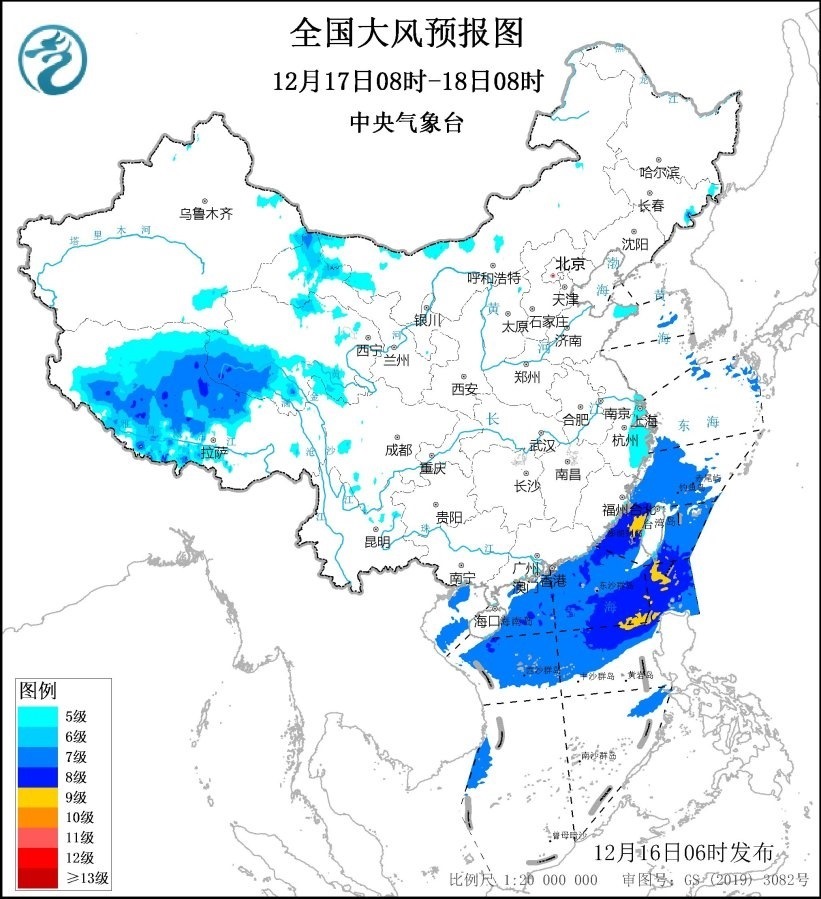 12月17日08時至18日08時,內(nèi)蒙古西北部、西藏中西部、甘肅河西、上海、浙江東部等地有5級、陣風6級的大風,其中,西藏中西部、甘肅河西等地部分地區(qū)有6~7級、陣風8級的大風;東海南部海域、臺灣海峽、臺灣以東洋面、巴士海峽、南海北部和中部海域、北部灣將有7~8級、陣風9~10級的大風,其中臺灣海峽、巴士海峽和南海東北部的部分海域風力可達9級、陣風10~11級。
