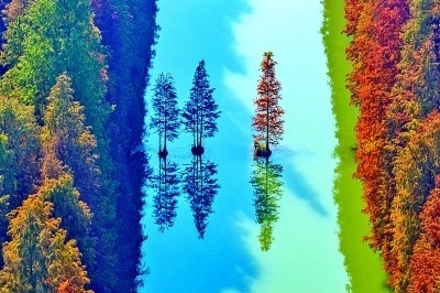 初冬時節(jié),江蘇淮安金湖縣水上森林景區(qū)五彩斑斕。新華社發(fā)