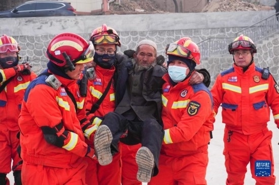 12月19日,在甘肅省臨夏回族自治州積石山保安族東鄉(xiāng)族撒拉族自治縣大河家鎮(zhèn)大河村,消防人員開展救援。