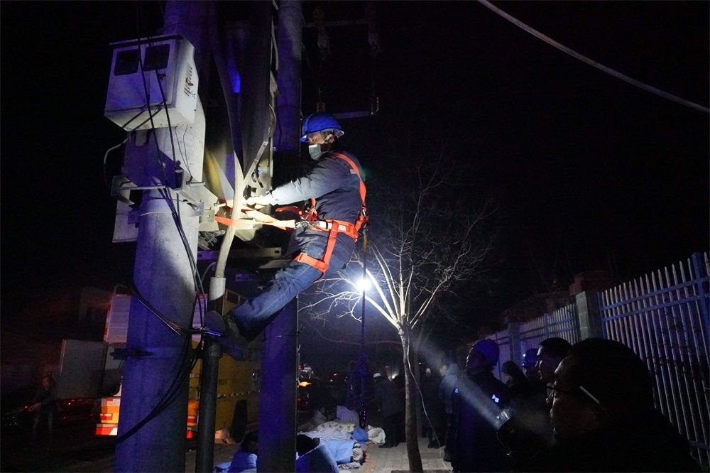 12月19日,在甘肅省臨夏回族自治州積石山保安族東鄉(xiāng)族撒拉族自治縣中西醫(yī)結(jié)合醫(yī)院門口,電力部門工作人員搶修電力設施。新華社記者 馬希平 攝