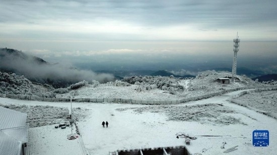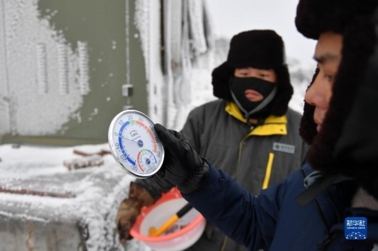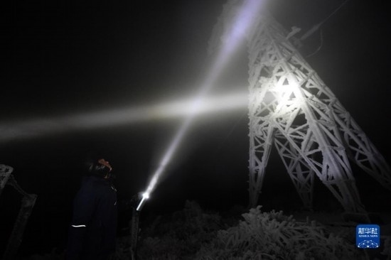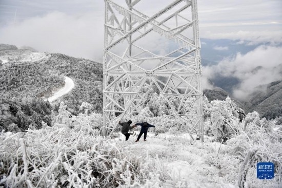 12月18日,尹斌和龍昱君在110千伏西公線(xiàn)001號(hào)監(jiān)測(cè)哨所觀測(cè)鐵塔和導(dǎo)線(xiàn)的覆冰情況。