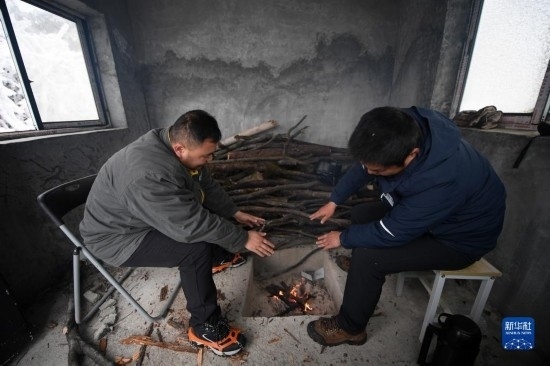 12月19日,尹斌(右)和龍昱君在110千伏西公線(xiàn)003號(hào)監(jiān)測(cè)哨所休息。這座水泥小屋在2020年修建,以便輸電運(yùn)檢工觀測(cè)融冰時(shí)休息。