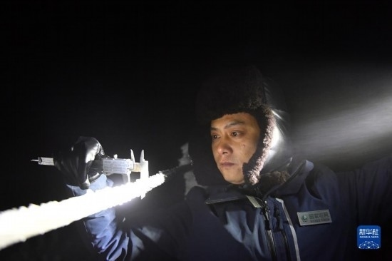 12月18日夜間,尹斌在110千伏西公線(xiàn)001號(hào)監(jiān)視哨所用游標(biāo)卡尺測(cè)量導(dǎo)線(xiàn)覆冰厚度。