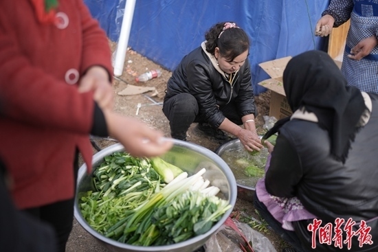 12月20日下午,青海省海東市民和縣中川鄉(xiāng)金田村,在救助點準(zhǔn)備飯菜的婦女。中青報·中青網(wǎng)記者 李雋輝/攝