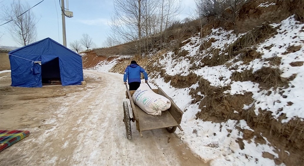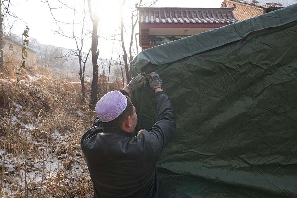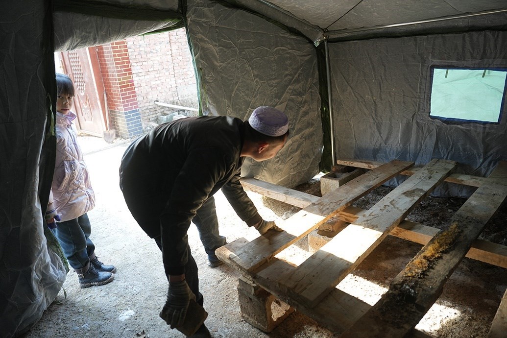 12月20日,馬國忠一家回到村里,拿塑料布在家附近搭了個簡易帳篷,兩根木頭、一條橫梁支起來,怕煙筒把塑料烤化,帳篷里不能烤火,頂多防風,但馬國忠覺得比車里強多了。家里的電熱毯拿出來鋪上,他才睡了個安穩(wěn)覺。只是半夜來了余震,又醒了。他止不住想:下一步怎么辦?后面會不會繼續(xù)搖?他家鋼管焊的牛棚頂晃得“乒乒乓乓”響。