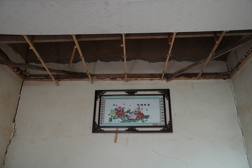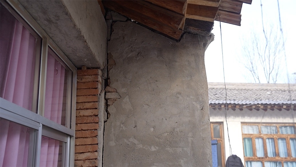 12月23日當天,馬國忠和叔叔伯伯兩家都在家門前搭起剛領的帳篷。叔叔馬進明家受損嚴重,兩堵磚墻的銜接處完全開裂,像條拉鏈被猛地拽下;天花板掉了大半,木頭架構的屋頂赫然露在豁口里。所幸,他和家人平時在縣城租房住。