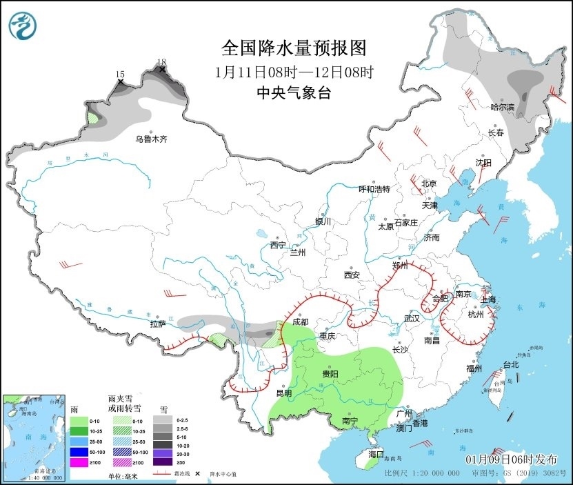 1月10日08時至11日08時,新疆北疆北部、內(nèi)蒙古東北部、黑龍江中西部等地的部分地區(qū)有小到中雪或雨夾雪,其中新疆阿勒泰、塔城的部分地區(qū)有大雪,局地暴雪(10~18毫米);四川南部和東部、重慶西部、湖南西南部、貴州、廣西、云南東部的等地的部分地區(qū)有小到中雨。內(nèi)蒙古中東部、東北地區(qū)南部、河北北部、山東半島、浙江、西藏等地的部分地區(qū)有4~6級風(fēng),其中浙江東部等地的部分地區(qū)風(fēng)力可達7級以上;渤海北部、渤海海峽、黃海南部、東海、臺灣海峽、臺灣以東洋面、巴士海峽、南海中北部等海域有6~7級風(fēng)、陣風(fēng)8~9級(見圖2)。