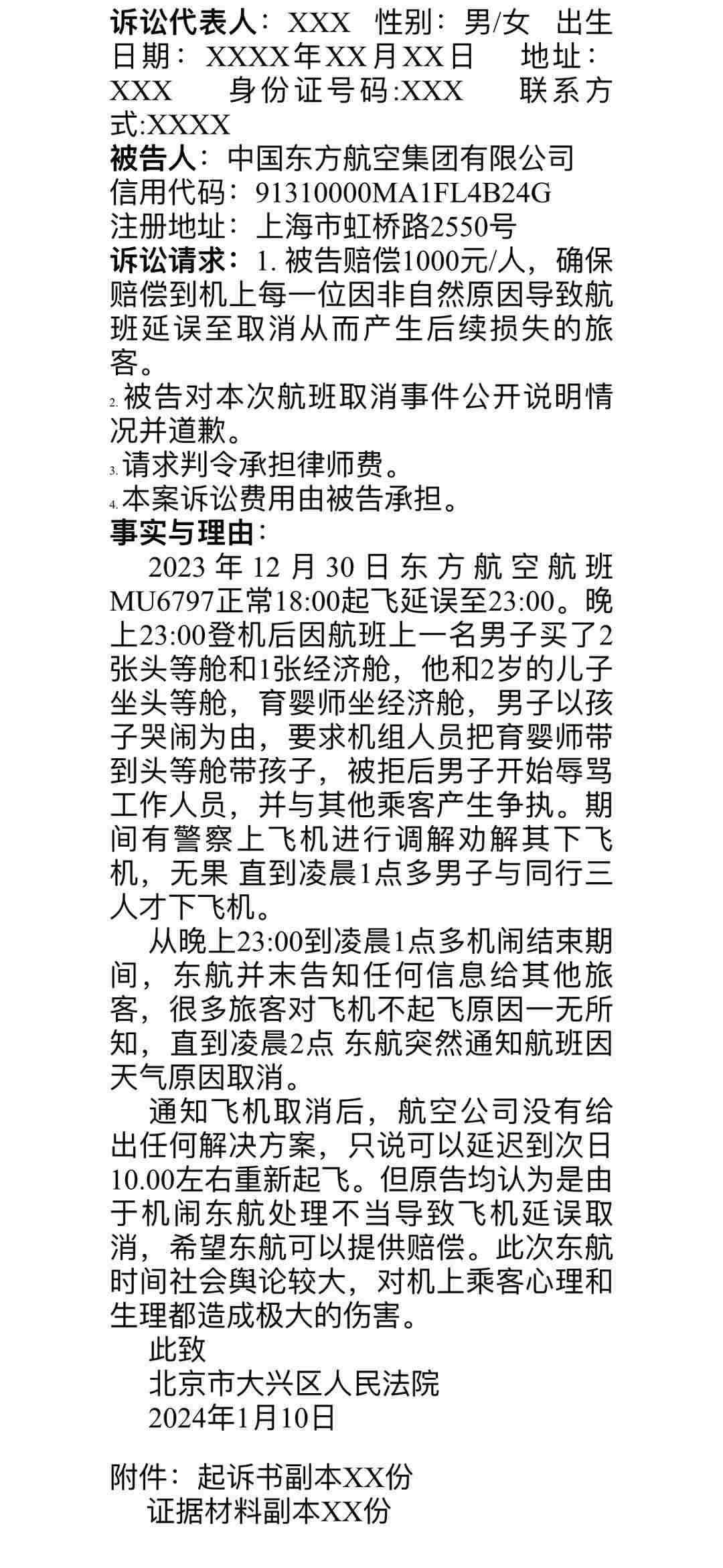 群內(nèi)發(fā)出的起訴書寫道:“從當(dāng)日23點(diǎn)到次日凌晨1點(diǎn)多機(jī)鬧結(jié)束期間,東航并未告知任何信息給其他旅客,很多旅客對飛機(jī)不起飛原因一無所知,直到凌晨2點(diǎn),東航突然通知航班因天氣原因取消。通知飛機(jī)取消后,航空公司沒有給出任何解決方案,只說可以延遲到次日10點(diǎn)左右重新起飛。但原告均認(rèn)為是由于機(jī)鬧,東航處理不當(dāng),導(dǎo)致飛機(jī)延誤取消,希望東航可以提供賠償。此次東航事件社會(huì)輿論較大,對機(jī)上乘客心理和生理都造成極大的傷害?!睋?jù)悉,乘客們擬起訴至北京市大興區(qū)人民法院。