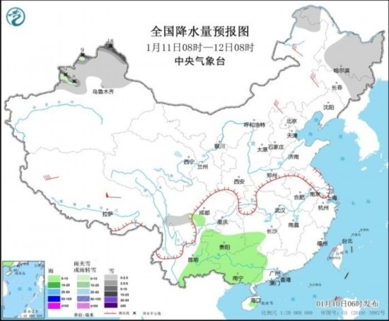 全國降水量預(yù)報圖(1月10日08時-11日08時)