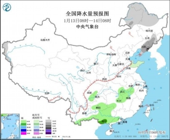 全國(guó)降水量預(yù)報(bào)圖(1月13日08時(shí)-14日08時(shí))