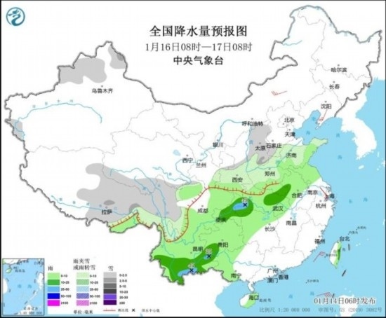 全國降水量預(yù)報圖(1月14日08時-15日08時)