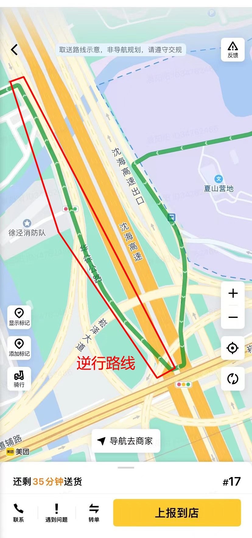 “途經(jīng)滬青平公路時,平臺也愛規(guī)劃逆行路線?!标愱栮柼峁┑牡?條逆行路線正屬于這一情況。這是從京華路187弄送往南山雨果小區(qū)的一單,平臺規(guī)劃的路線中,指示騎手從明珠路右拐進入滬青平公路向西騎行至葉聯(lián)路再向南。可是,滬青平公路在葉聯(lián)路路口處沒有過街橫道線,此時,平臺索性規(guī)劃騎手沿著滬青平公路南側(cè)逆向騎行。1月8日,記者實地走了一遍這段路線:若騎手沿著滬青平公路北側(cè)騎行,需一直向西騎到徐盈路才能過街,再沿著滬青平公路南側(cè)向東抵達葉聯(lián)路。手機顯示,繞行路線比美團平臺規(guī)劃路線遠了1.2公里。