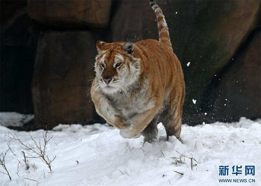 河南省沁陽市和生森林動物樂園大型貓科動物散養(yǎng)區(qū),一只孟加拉金虎在雪地上奔跑。