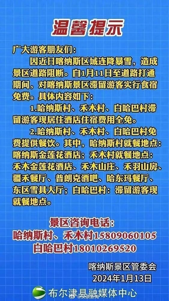 1月13日,喀納斯景區(qū)發(fā)布公告稱,對滯留游客實(shí)行食宿免費(fèi) 來源網(wǎng)絡(luò)