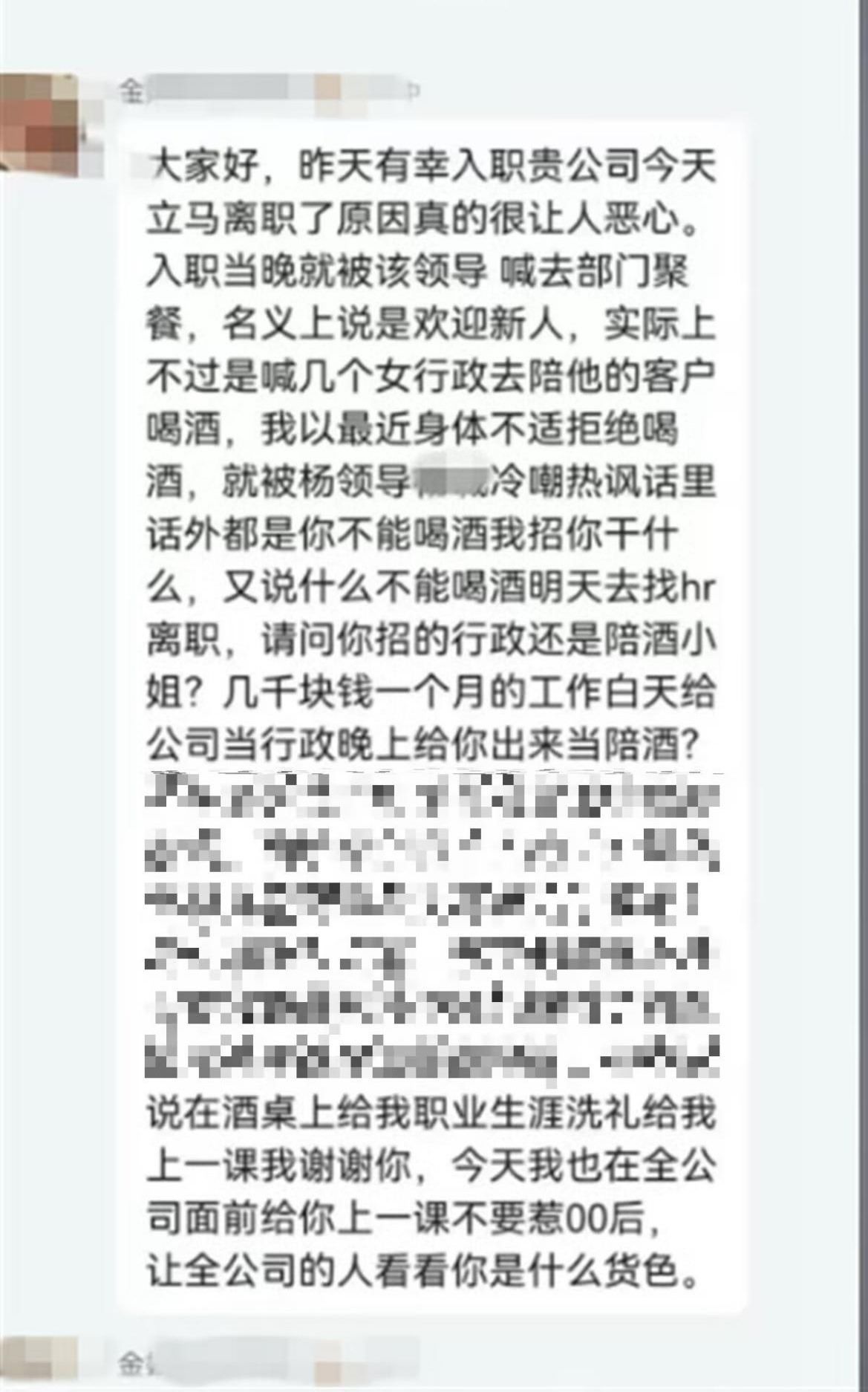 ·南京一00后女員工被要求陪客戶喝酒憤而辭職?涉事公司稱其捏造事實,警方介入:正在調查處理。