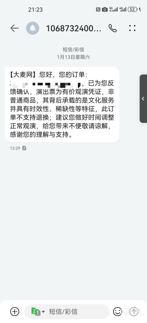 周女士說(shuō)自己第一時(shí)間就通過(guò)多個(gè)渠道嘗試退票,但都沒(méi)有成功?!叭斯た头墓ぷ鲿r(shí)間是早上9點(diǎn)到晚上8點(diǎn),我打電話的時(shí)候不在他們工作時(shí)間范圍內(nèi)。當(dāng)時(shí)也確實(shí)聯(lián)系不到其他渠道,于是我就在12315,包括黑貓投訴進(jìn)行退票退款的申請(qǐng)。13號(hào)早上9點(diǎn),大麥客服說(shuō)此訂單不支持退換,13號(hào)下午1點(diǎn)半的時(shí)候,給了我一個(gè)反饋短信,說(shuō)是已為我反饋確認(rèn),演出票為有價(jià)觀影憑證非普通商品,其背后承載的是文化服務(wù),并具有時(shí)效性、稀缺性等特征,此訂單不支持退換,然后就建議我做好時(shí)間調(diào)整正常觀演?!?/p>