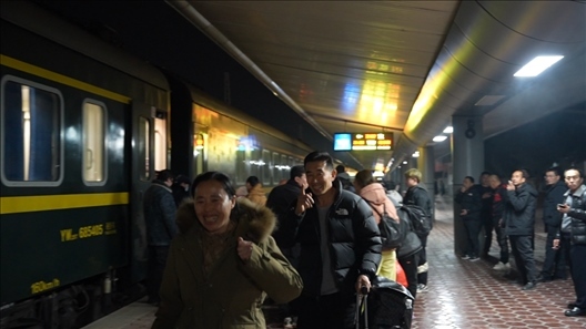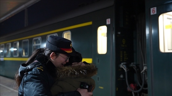 14號車廂內(nèi),來自黑龍江省齊齊哈爾市泰來縣的王興海和陳玉倩望著車窗外、站臺上的王靚怡,喜笑顏開。跨越2700多公里、歷時(shí)52個(gè)小時(shí),只為給女兒一個(gè)驚喜,陪她在崗過年。
