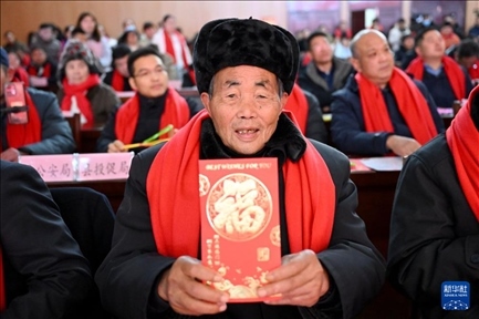 2月1日,在鳳陽縣小崗村,“大包干”帶頭人嚴(yán)金昌展示自家領(lǐng)取的分紅紅包。新華社記者 黃博涵 攝