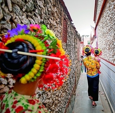 “今生戴花,來世漂亮”。在我國(guó)福建省泉州市的蟳埔村里,總能聽到這樣的話語。這座漁村,無論是巷子里拍照的姑娘,還是街邊滿頭銀發(fā)撬海蠣的阿婆,都盤發(fā)梳成圓髻,系上紅頭繩,插著滿頭花,成為村里靚麗的“風(fēng)景線”。五彩斑斕的簪花、象牙固定的發(fā)髻、蚵殼筑成的房屋……獨(dú)具特色的文化印記讓這座漁村迅速“出圈”,成為知名網(wǎng)紅地。