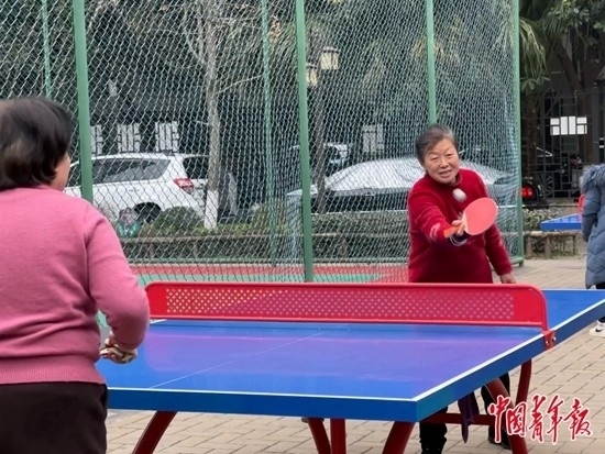 小孩子在追逐嬉鬧,老人們手拿乒乓球拍切磋技藝。不冷的冬日中,成都市青羊區(qū)蘇坡街道清波社區(qū)黨群服務(wù)中心門前的廣場(chǎng)十分熱鬧。