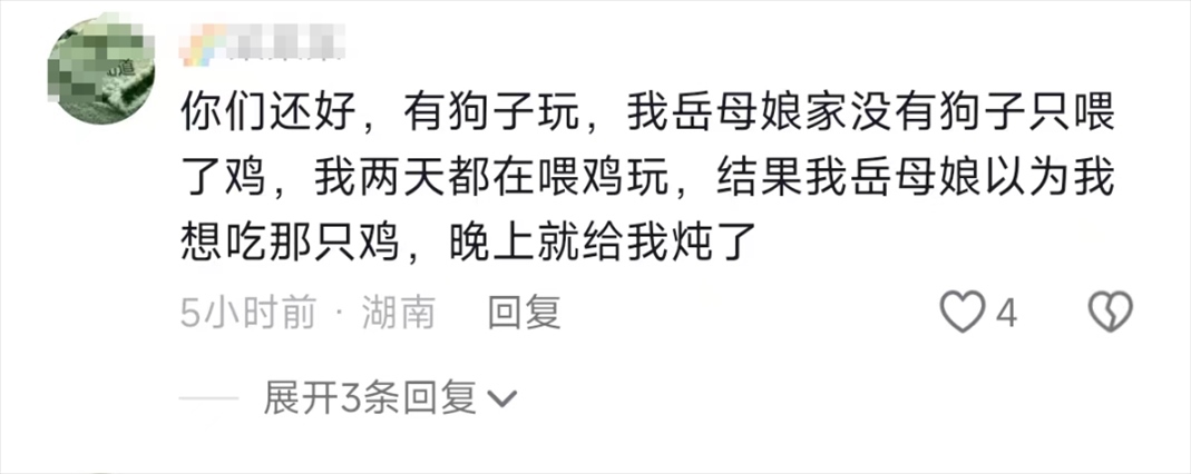 有的網(wǎng)友為了防止丈人家的狗不陪自己玩,干脆自己帶了一只狗去擼,而那些沒有狗玩的女婿就比較落寞了,只能找些小雞小豬聊聊天。