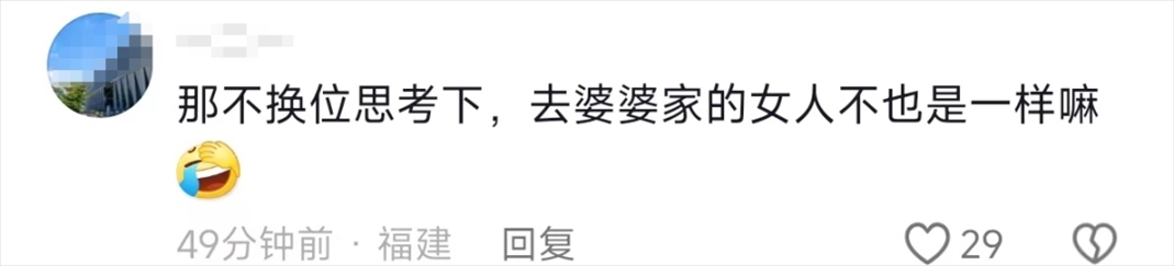 還有網(wǎng)友表示,這個(gè)時(shí)候,女婿更應(yīng)該能過體諒媳婦在婆家過年的難處了,大家過年要互相體諒,換位思考。