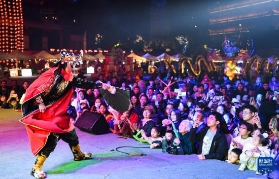 2月14日,市民和游客在重慶南濱路鐘樓廣場(chǎng)觀看川劇表演。