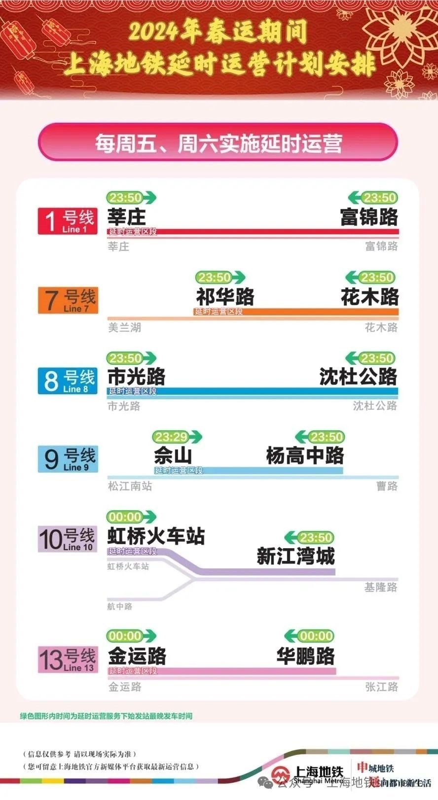 2月17日(周六),上海地鐵1、7、8、9、10、13號(hào)線繼續(xù)執(zhí)行常態(tài)周末延時(shí)運(yùn)營(yíng)方案,提請(qǐng)市民乘客注意末班車時(shí)間。