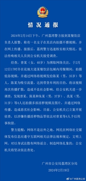 ·廣州警方通報女網(wǎng)紅在海底撈做不雅行為:4人被刑拘。