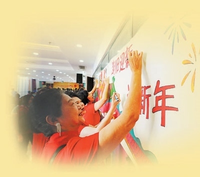 盛康園社區(qū)居民舉行迎新春聯歡會,居民在畫布上寫下新春心愿。本報記者 李家鼎攝