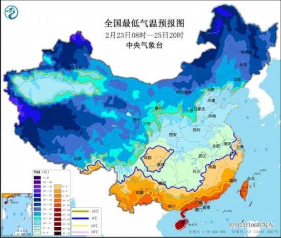 全國(guó)最低氣溫預(yù)報(bào)圖(2月23日8時(shí)-25日20時(shí))