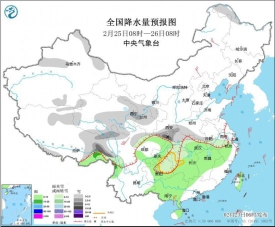 全國(guó)降水量預(yù)報(bào)圖(2月25日8時(shí)-26日8時(shí))