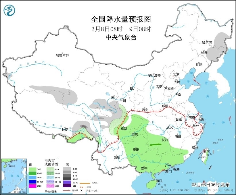 圖3 全國降水量預報圖(3月8日08時-9日08時)