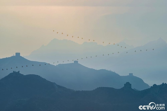 3月7日,河北承德,遷徙的候鳥(niǎo)飛過(guò)金山嶺長(zhǎng)城上空。