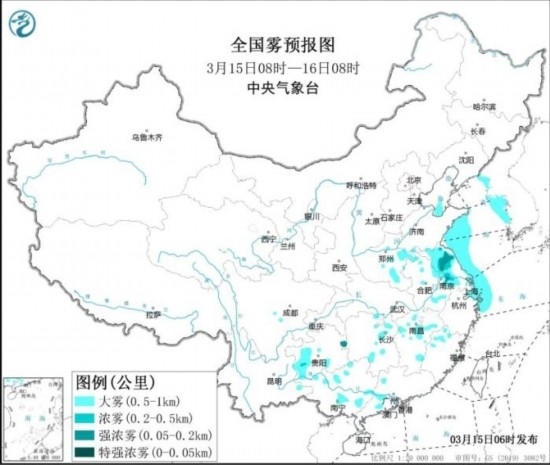 全國霧預(yù)報(bào)圖(3月15日08時(shí)-16日08時(shí))。圖片來源:中央氣象臺(tái)網(wǎng)站
